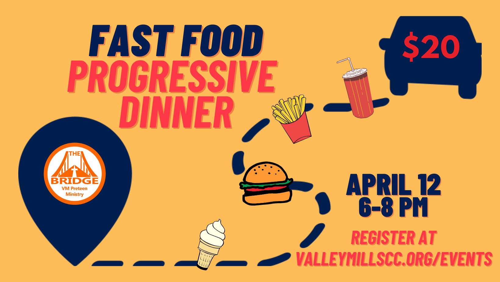 Join us for a fun night with a Fast Food Progressive Dinner.